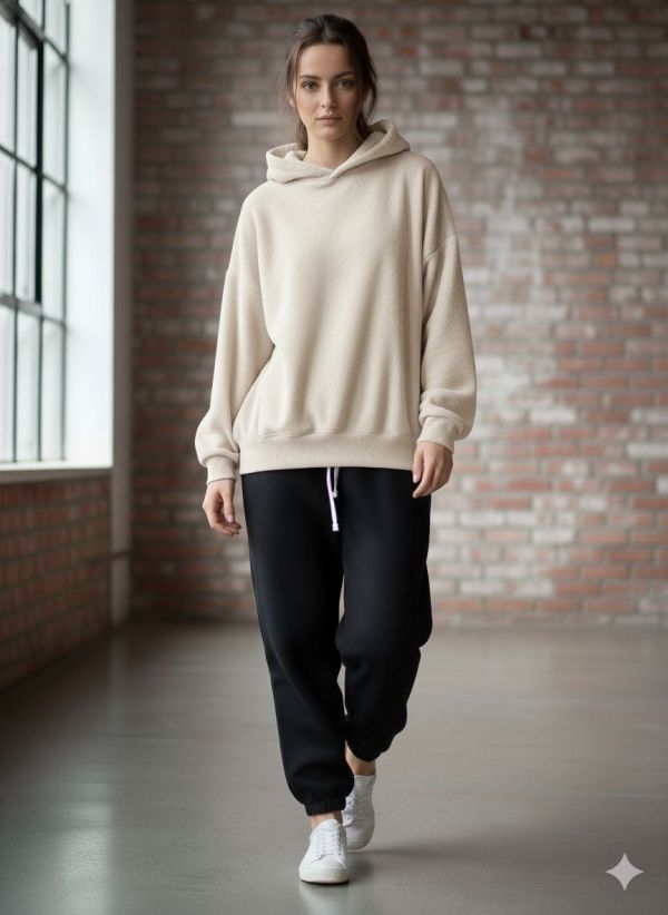 228002-12 бежевый женский спортивный костюм (YOLA. турецкий полар-флис, OVERSIZE, с капюшоном, 4ед, размеры норма:S/M. S/M. L/XL